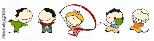 children, line, sport activity, set sports equipments, soccer ball, jump rope, badminton, tennis, basketball, ping pong