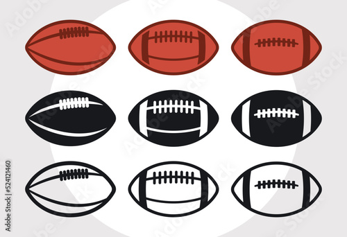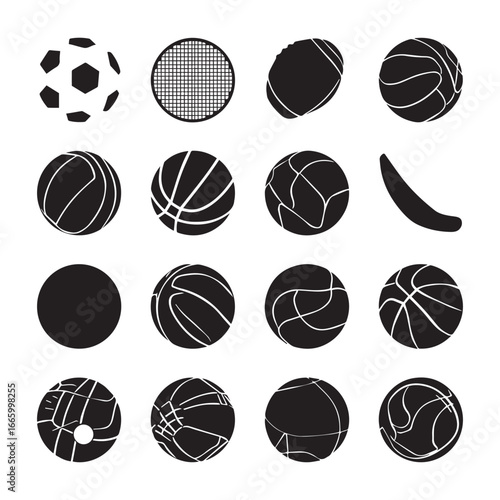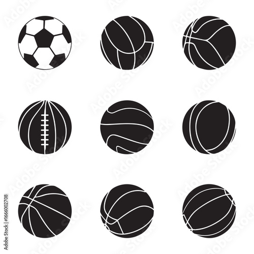 sports balls Icons vector set silhouette graphics. Illustration of american football and soccer, baseball, basketball, bowling, snooker volleyball and tennis.