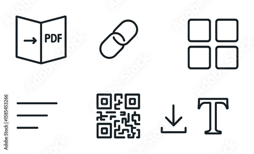 PDF file icons set showing document text and download outline designs in different styles. Vector graphic.