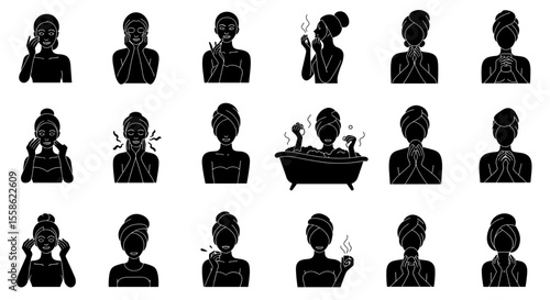Sauna and Spa Icon Pack depicting various elements of a spa setting. Relaxing figures, tools, equipment, and timekeeping items, essential for a spa experience.