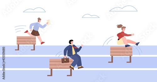 Business people overcome hurdles. Steeplechase competition, leadership overcoming vector concept
