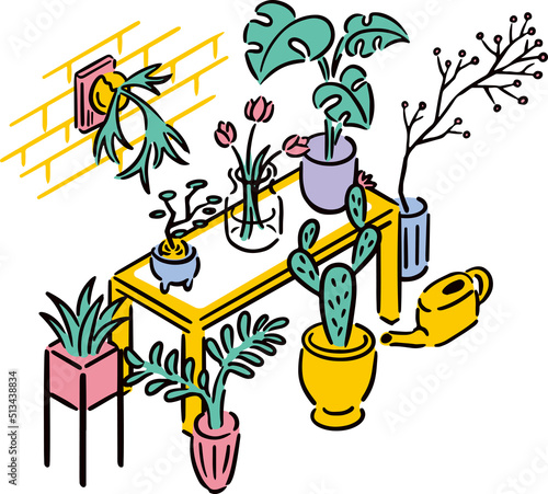 カフェ風のインテリアを彩る観葉植物とペンダントライトのベクターイラストセット|観葉植物,ライト,吊り下げ照明,鉢植え,植物