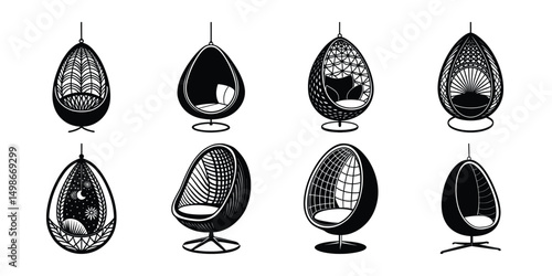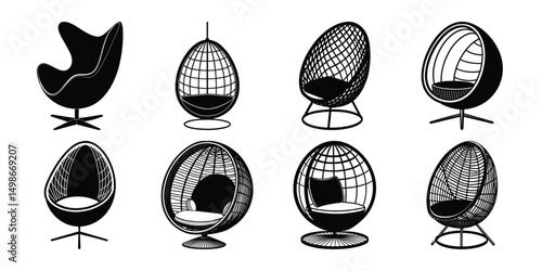 Vector illustration set of egg chair, rattan comfortable armchair isolated on white background.