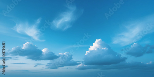 Clear blue sky with fluffy white clouds, a serene and peaceful natural scene