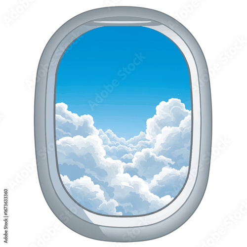 Vector illustration of a passenger airplane flying in the sky above the clouds, symbolizing air travel and vacation journeys
