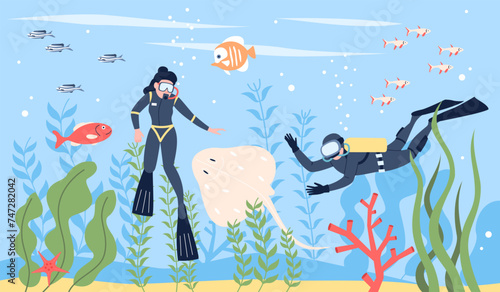 Underwater swimmers swim in ocean. Scuba diving tourists or professional. Resting and explore sea, fish and plants, flat recent vector scene