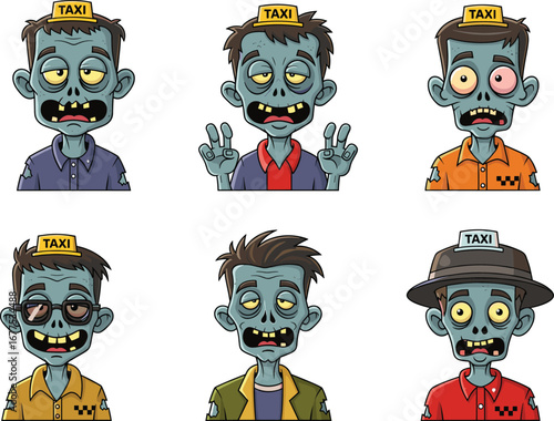 Six cartoon illustrations of diverse taxi drivers in yellow cars against city skylines
