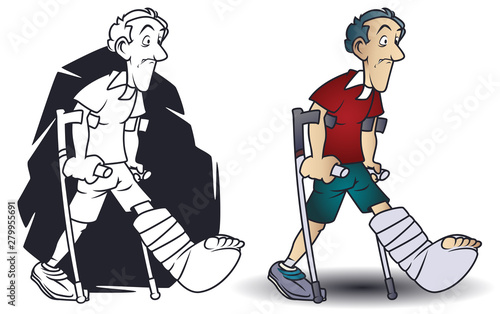 Funny little men. Man on crutches. Leg in cast.