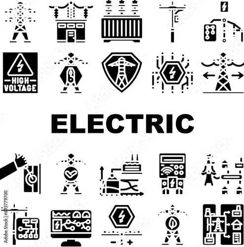 Electric power icons set showing transmission lines plug lightning factory substation cable energy infrastructure industrial electricity symbols illustration design collection utility grid technology