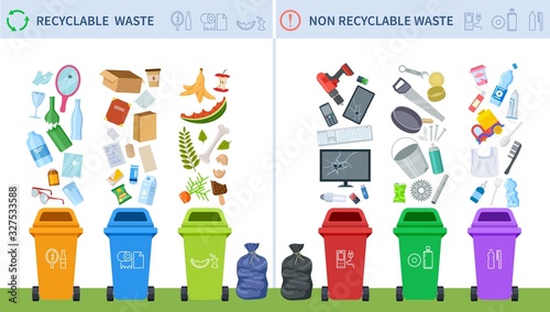 Garbage inside trash bins. Waste management concept: segregation, separation, trash bins, sorting, recycling, garbage can. Paper, plastic, scrap metal, glass, organic waste, e-waste.
