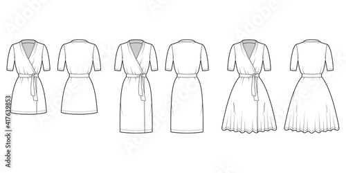 Set of Wrap dress technical fashion illustration with deep V-neck, short sleeves, knee mini length, pencil circular cut, tie. Flat apparel front, back, white, grey color style. Women, men CAD mockup