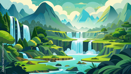 Ban Gioc Waterfall, Cao Bang, Vietnam – Cascading waters descend in multiple tiers. Surrounded by lush greenery, this serene natural wonder blends power and peace for a richly detailed vector backdrop