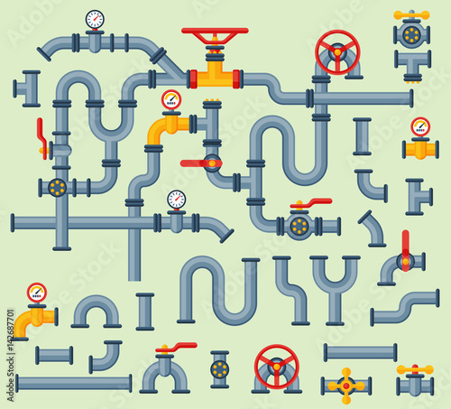 Details pipes different types collection of water tube industry gas valve construction and oil industrial pressure technology plumbing vector illustration.