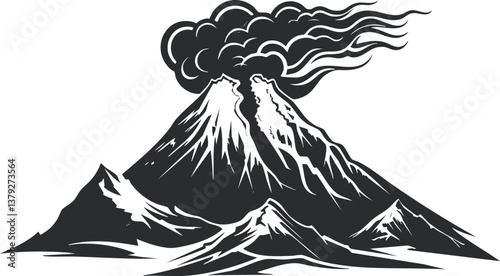 Detailed black and white vector illustration of a volcanic eruption with dramatic ash clouds and dynamic lines for creative projects
