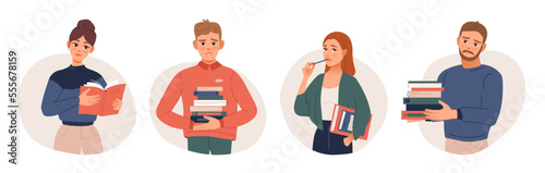 Bookcrossing concept. Happy people exchanging, borrowing and recommending paper books. Group of man and woman reading. Readers swap literature. Flat vector illustration isolated on white background