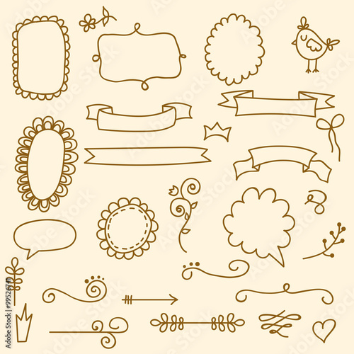 Vector floral decor set of hand drawn doodle frames, wreaths, borders, elements. Isolated.