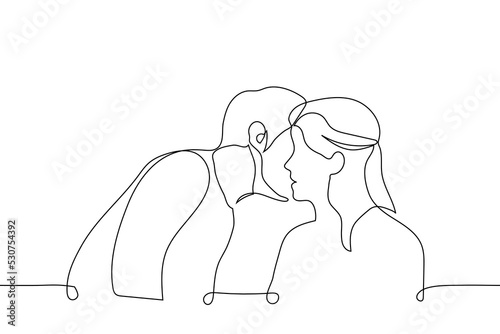 man leaned over a seated man and whispers in his ear or kisses his cheek greeting or congratulating - one line drawing vector. concept of gossip spreading or homosexual men flirting, queerbaiting
