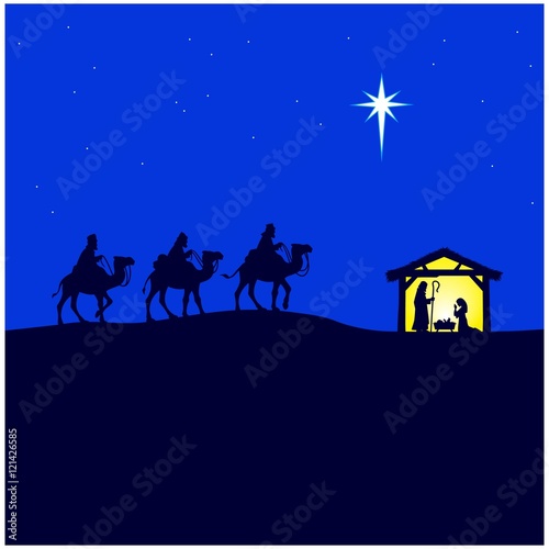 Nativity, silhouette, Christmas, holy, manger, baby, Jesus, Mary, Joseph, Magi, wise men, camels, Bethlehem, star, religious, festive, holiday, tradition, design, illustration, art, concept