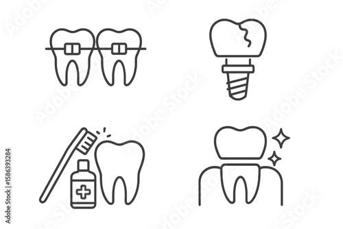 Dental Health Icons Set Illustrating Tooth Care and Treatment in a Clinical Setting for Dentistry Practices:  A Collection of Oral Hygiene, Braces, Implants, Cavities, Decay Prevention, Cleanliness, a