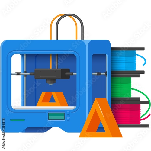 3D tisk vektorový koncept plakát v plochém stylu. Designové prvky a ikony. Průmyslová 3D tiskárna.