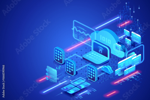 Banner webových stránek sítě 5G, šablona návrhu webové stránky, izometrické zářící neonové vektorové ilustrace. Vysokorychlostní přenos dat. Chytré město. Mobilní síť 5. generace.