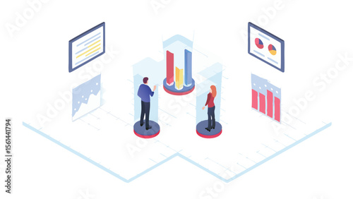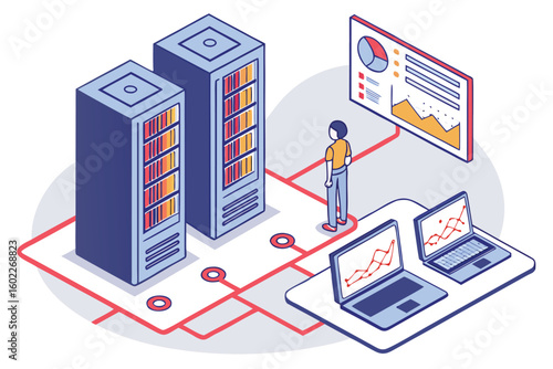 5G síťová bezdrátová technologie vývojový diagram, plochá vektorová izometrická ilustrace. 5G spotřebitel s mobilním telefonem, komunikační věží, síťovým serverem, měřičem rychlosti internetu, notebookem, smartphonem.