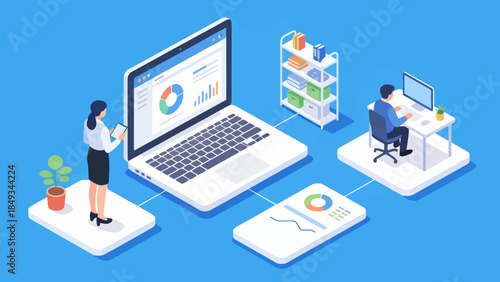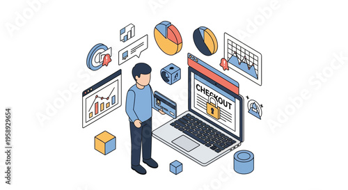 5g wifi vysokorychlostní internet fllowchart, vektorové izometrické ilustrace. Podnikatel při pohledu na měřič rychlosti internetu na obrazovce notebooku. Smartphone, satelit, router, datový cloud.