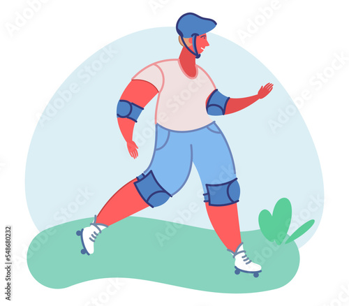 Kolečkové bruslař ploché vektorové ilustrace. Mladý muž, který nosí sportovní ochranné pomůcky, si rychle užívá letní aktivní odpočinek. Kreslená mužská postava milovník sportu