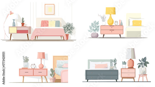 Dospělé ženy obývací pokoj interiér, vektorové ploché ilustrace. Útulný pokoj s nábytkem, knihami a pokojovými rostlinami na policích, lampou, knihami, fotkami a mobilním telefonem na nočním stolku, šicím strojem atd.