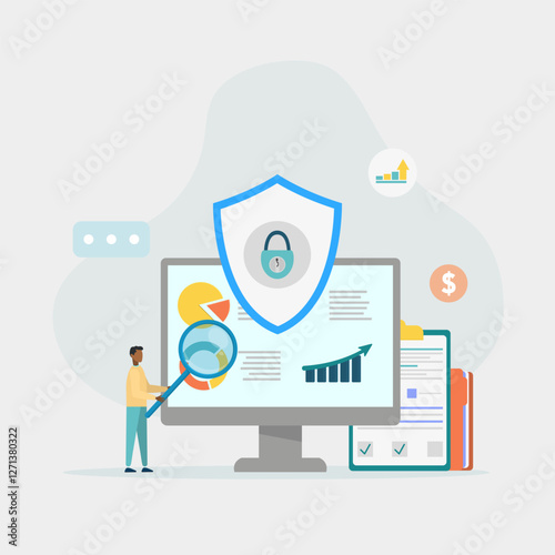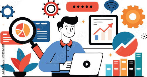 Dospělý muž postava s lupou a chytrý telefon, vektorové ploché ilustrace. Muž čtení zpráv, digitální knihy, posílání e-mailů, sledování videa, poslech hudby na mobilním telefonu nebo tabletu.