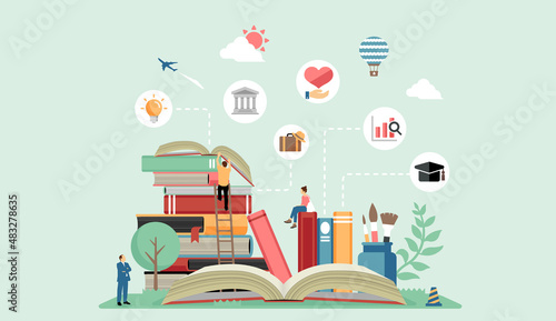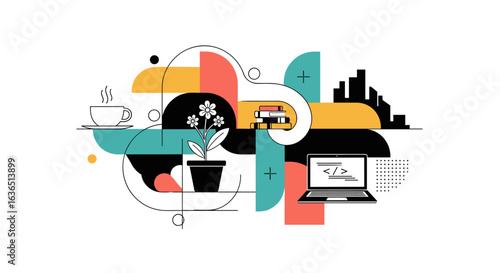 Letištní vektorová plochá ilustrace. Letadlo, letenky, cestovní pas, zavazadla, šálek čaje, zásobník na jídlo s víkem dome. Koncepce letištních služeb a zařízení pro webový banner, webovou stránku atd.