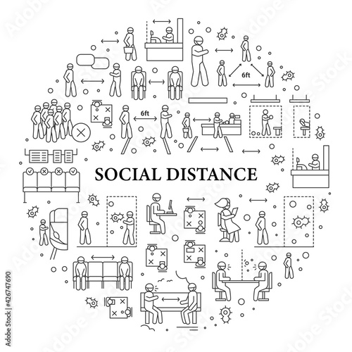 Kreativní koncept letiště S infografickými prvky nebo šablonami tenké čáry. Vektorová koláž s čekáním na odjezd, odbavením, manipulací se zavazadly, ikonou letadel, autobusů a online rezervačních služeb