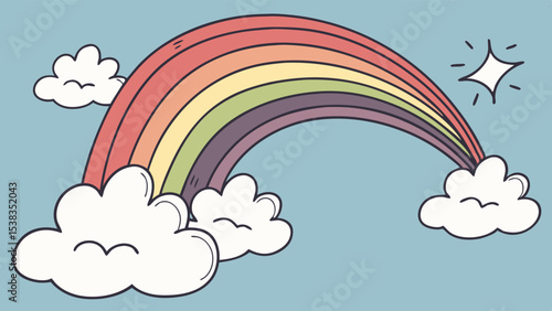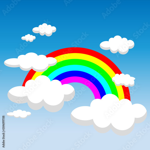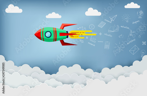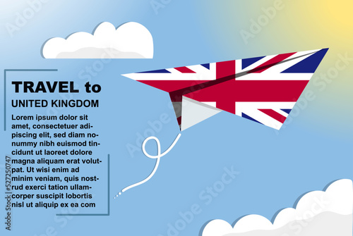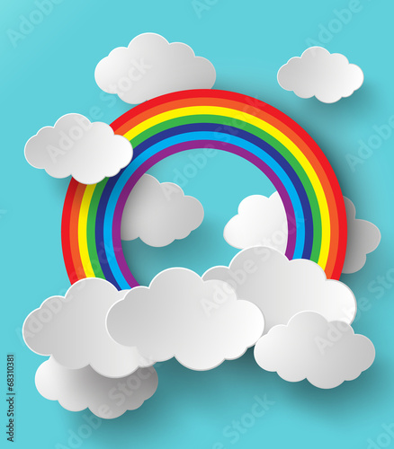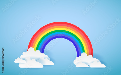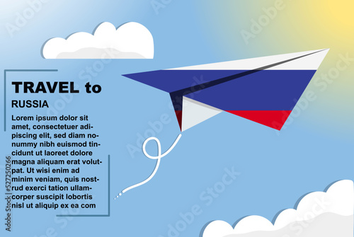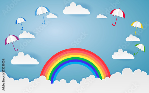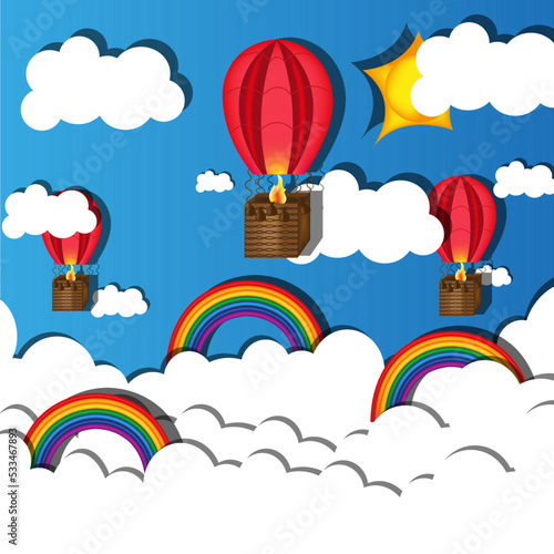 Vzducholoď s červenou stuhou duhy a mraky na obloze. Vektorové ilustrace ve stylu papírového umění. Cestovní plakát banner design šablony.