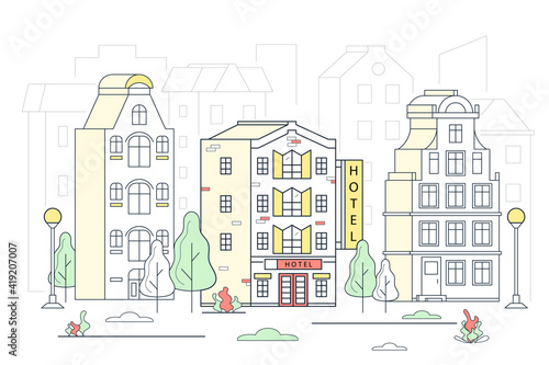 Pohostinství hotel, vektorové ploché styl designu ilustrace. Budova luxusního hotelu, postavy cestovatelů mužů a žen. All inclusive Hotel a resort koncept pro web banner, webové stránky, atd.