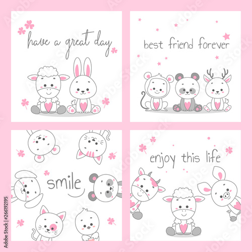 Roztomilé přání k narozeninám alpaky. Vektorové ručně kreslené ilustrace. Všechno nejlepší k narozeninám karty šablony pro děti s legrační barevné Lamy drží balónky, dárkové krabičky, dort, květiny.