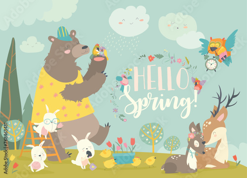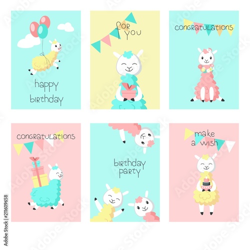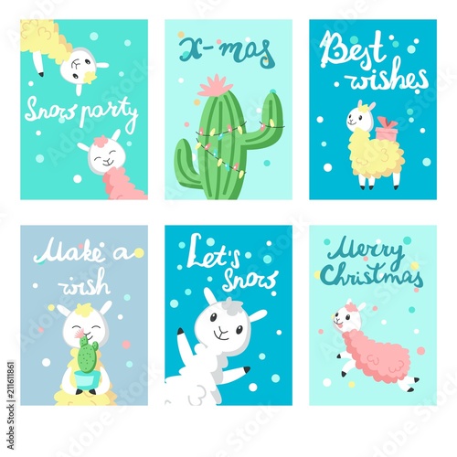 Roztomilý alpaka vánoční pohlednice. Veselé vánoční přání vektorové šablony pro děti se sněhovými vločkami, vtipné barevné Lamy s kaktusy, dárkové krabičky, ručně psaný text.