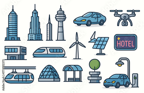 Americký slavný městský orientační bod a budova vector set. New York, Chicago, Washington a Las Vegas atrakce, národní symbol. Ilustrace Cestovní destinace