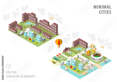 Zábavní park a dětské hřiště atrakce ploché vektorové izometrické ilustrace. Kolotoč středověký hrad ruské kolo cirkusový stan nárazník auta jízda oblast, houpačka, trampolína, pískoviště. Venkovní cvičení.