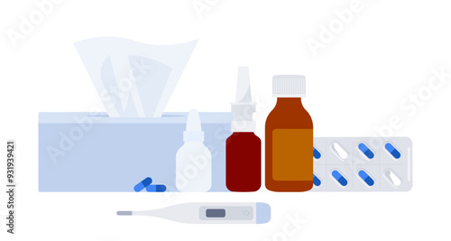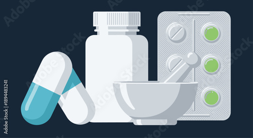 Antibiotikum pro produkci ryb vektorové ilustrace. Konzervační látky a farmaceutické přísady pro mořské plody. Sleď v balení a pilulky, injekční stříkačka s injekcí, léky kapsle realistický 3D design