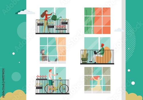 Bytový dům exteriér, sousedé sedí, stojí u okna uvnitř domu, na balkoně, ploché vektorové ilustrace. Lidé čtou knihy, zalévají květiny. Rezidenční dům a obyvatelé.