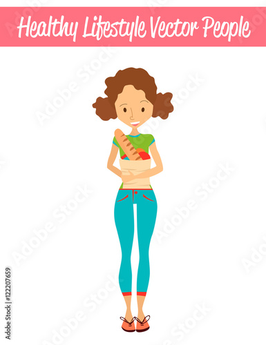 Vektorová ilustrace ženy, která drží koš plný jablek. Apple hunting season concept plochý designový prvek, ikona izolovaná na bílém pozadí.