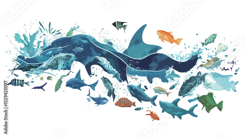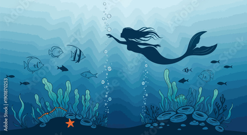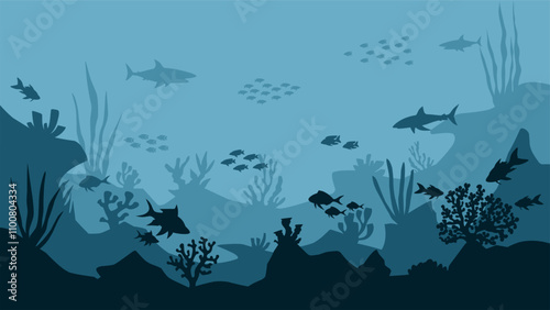 Vektorové vrstvený papír řez styl hluboké dno oceánu krajina s korálovým útesem, ryby, mořské řasy. Krásný podmořský svět ve veřejném akváriu ve stylu papírového umění. Podvodní mořské procházky atrakce.