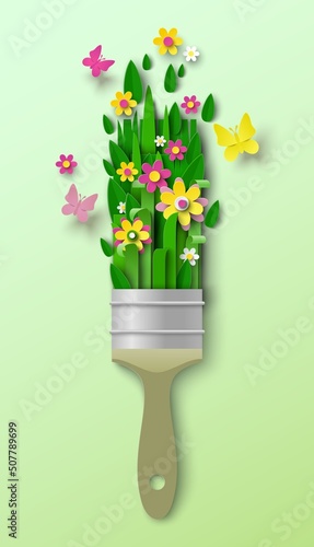 Umění štětec v malíř ruční kreslení flower splash vektorové ilustrace v papíru cut stylu. Umělecký plakát s květinovým pozadím. Barevné letní nebo jarní sezóna Příroda dekorace