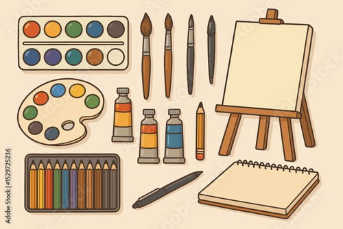 Umělecké malířské nástroje a příslušenství, vektorové izolované ilustrace. Umělecké vybavení a potřeby, umělecké nástroje a materiály stojan s plátnem, paleta, malířské štětce, malířské trubky, tužka, akvarel.