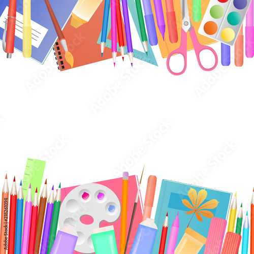 Umělecké nástroje a materiály Rám, vektorové ilustrace. Realistické malířské a kreslicí potřeby paleta umělců, štětce, malířské trubky, nože a tužky, akvarel, kopírovací prostor.