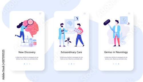 Umělá inteligence mobilní aplikace onboarding obrazovky. Menu banner vektorová šablona pro vývoj webových stránek a aplikací. Strojové učení, datové sady, technologie kybernetické mysli.