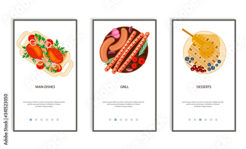 Asijská kuchyně vstupní stránka design, webové stránky banner šablony set, ploché vektorové ilustrace. Šéfkuchař vaření japonské ramen nudlová polévka, losos nebo tuňák sashimi pokrmy.
