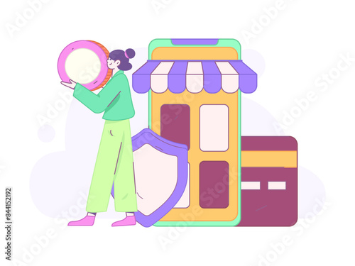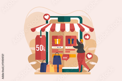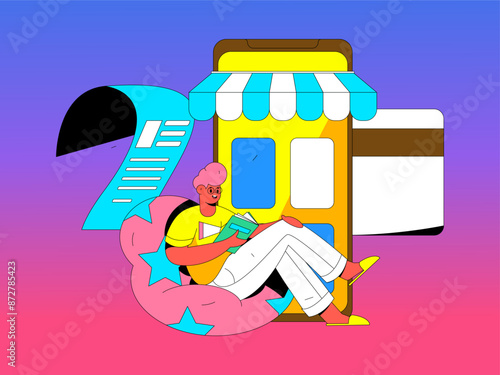 Audio média a knihy, vektorová plochá ilustrace. Smartphone s knihami na policích a lidé čtou, poslouchají audioknihy. E-learning, koncept mobilního vzdělávání pro webový banner, webovou stránku atd.