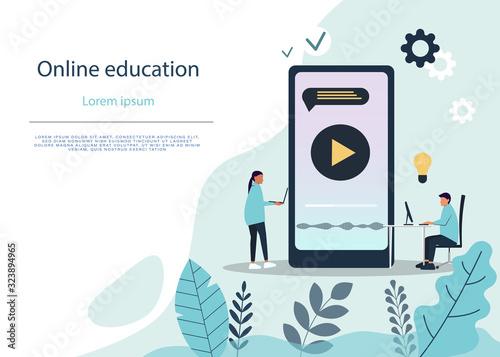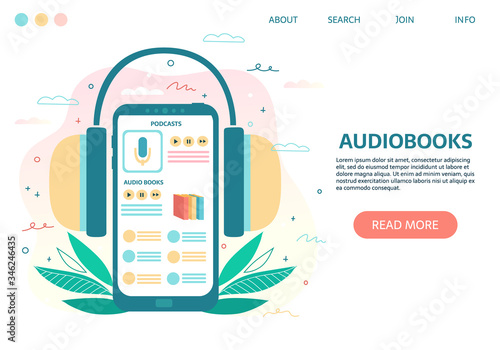 Šablona webové stránky vstupní stránky knihovny zvukových médií. Vektorové ilustrace smartphonu se zvukovými hudebními ikonami, lidé poslouchají hudbu z mobilního zařízení a počítače při práci nebo sportu.