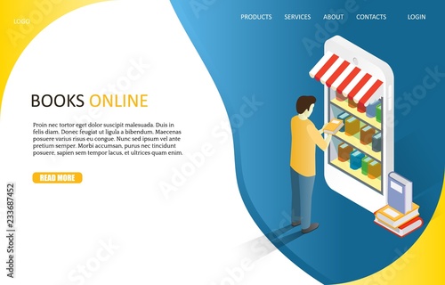 Audioknihy online vstupní stránka webová šablona. Vektorová izometrická ilustrace člověka stojícího před smartphonem s knihami a sluchátky. Knihy online koncept.